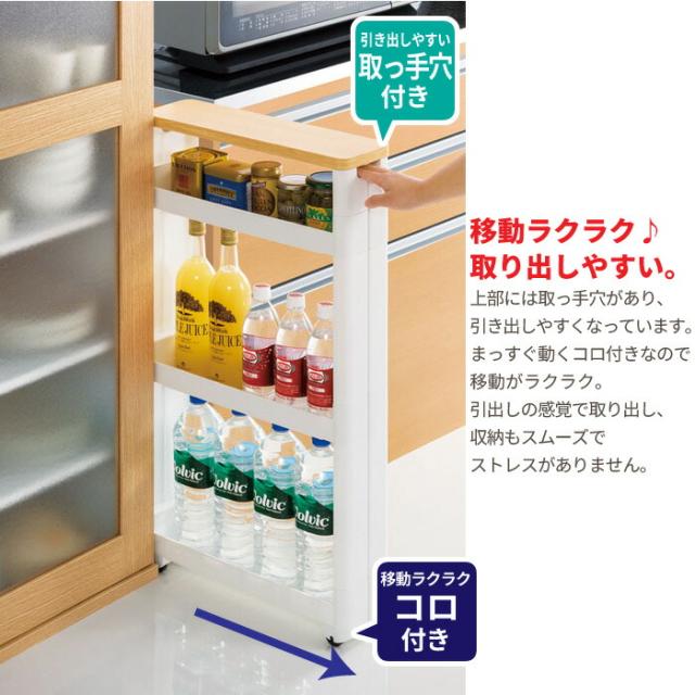 | わずかなすき間を小物収納庫に! どこにでもあるわずかなデッドスペースに調味料やボトル類をすっきり収納。 まっすぐ動くコロ付なので、引出しの間隔で出し入れできます。 側板が目隠しになり、たっぷり収納してもスッキリ見えます。 食器棚横、冷蔵庫・シンク横にオススメ。 キッチン以外でもリビングやランドリー収納、トイレ収納としても◎ ご自宅の食器棚や冷蔵庫、シンクなどのサイズに合わせて最適なサイズをお選びいただけます。 |