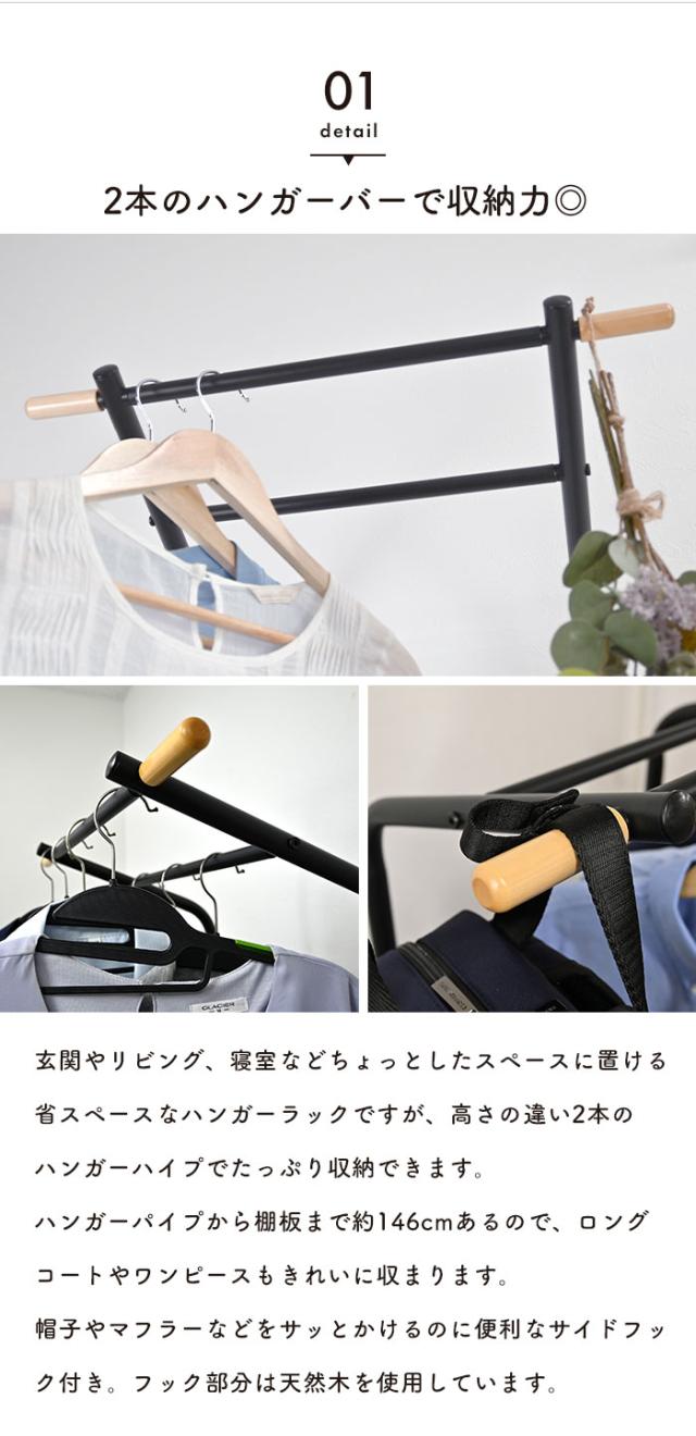 玄関やリビングなどちょっとしたスペースにおけるスリム設計ながら、高さの違う2本のハンガーパイプでたっぷり収納できます。