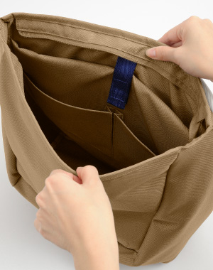 | メインルームにダイレクトにアクセスできる便利な背面ファスナーつき。 | 使用イメージ | フラップ裏にはストールやジャケットを通せるループ付きです。 | |||