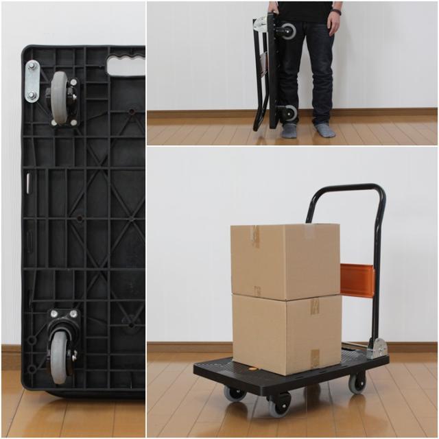 取っ手と荷台部分の二つ折りができ収納場所を取りません。