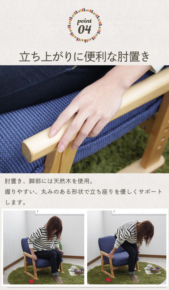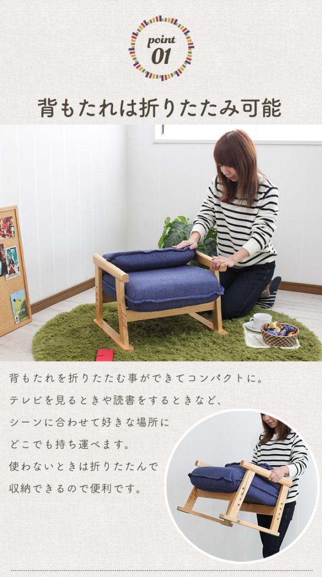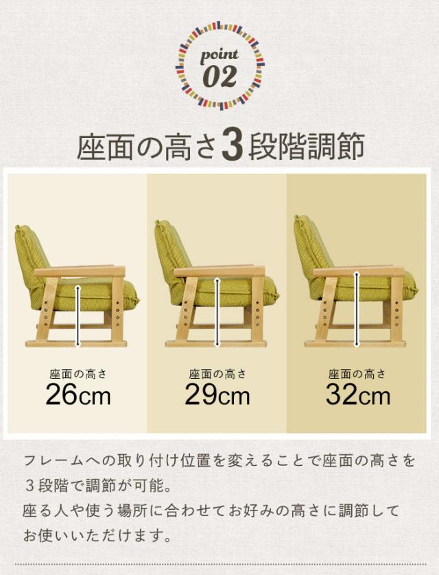 | ソファなどに使われる「ポケットコイル」を使用、ヘタリにくく弾力のある快適な座り心地。 フレームへの取り付け位置を変えることで座面の高さを「26cm・29cm・32cm」の3段階で調節できます。 フレームは天然木を使用。 肘置きに丸みを持たせ、立ち上がる際もしっかり握ることができます。 使わない時や移動する時に便利。 脚裏にはフェルトが付いているので、床や畳の傷を防ぎます。 和室にも洋室にも溶け込む、ちょっとくすんだ色合い。 ブルー、オレンジ、グリーン、ブラウンの4色よりお選びいただけます。 |