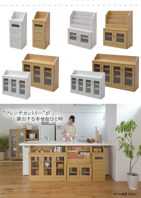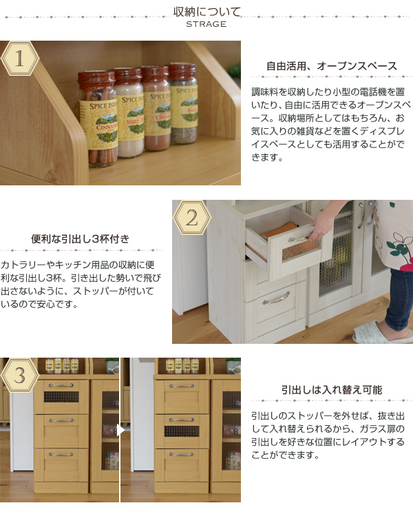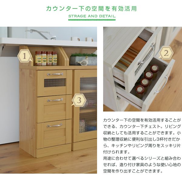 ■商品説明 木目調のシート、型板ガラスがカントリーテイストを演出するリュッカランドシリーズ。デザインと、収納力や機能性が両立したおしゃれかわいいシリーズです。カウンター下ラインナップは、カウンター下の無駄になりがちなスペースを有効な収納スペースに変えてくれます。チェストは引出しを3つ備えており、リビング・ダイニング・キッチンまわりの雑多な小物の収納に最適です。多くの腰窓より高さが低く薄型なので、リビングにも最適です。