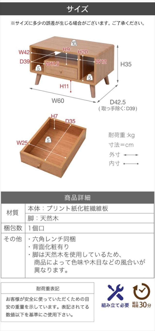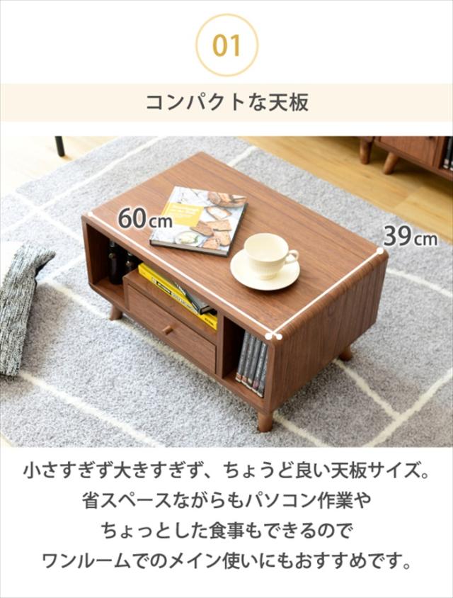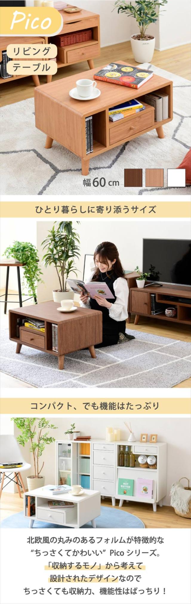 リビングテーブル 収納 幅60 奥行42.5 高さ35 Pico おしゃれ 引き出し付き かわいい 韓国風 コンパクト コーヒーテーブル 木製 収納付き リモコン収納