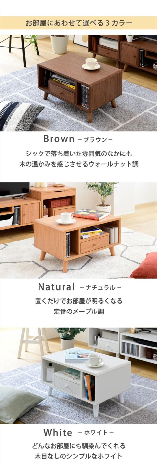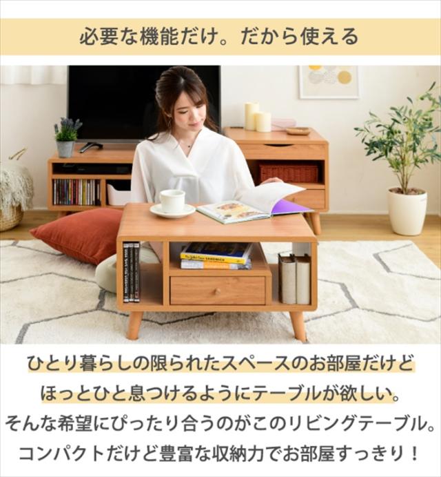 | 収納するものから設計されたデザインだから、コンパクトでも機能的。 リビングテーブルとしての機能だけでなく、DVDやティッシュ、雑誌が収納できるオープン部、リモコンなどを収納できる引き出し付き。 丸みのある北欧風のデザインはとてもおしゃれで、ひとり暮らしのお部屋にもぴったりです。 |
