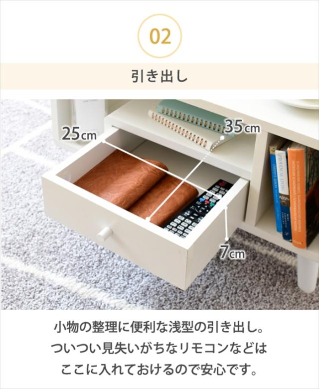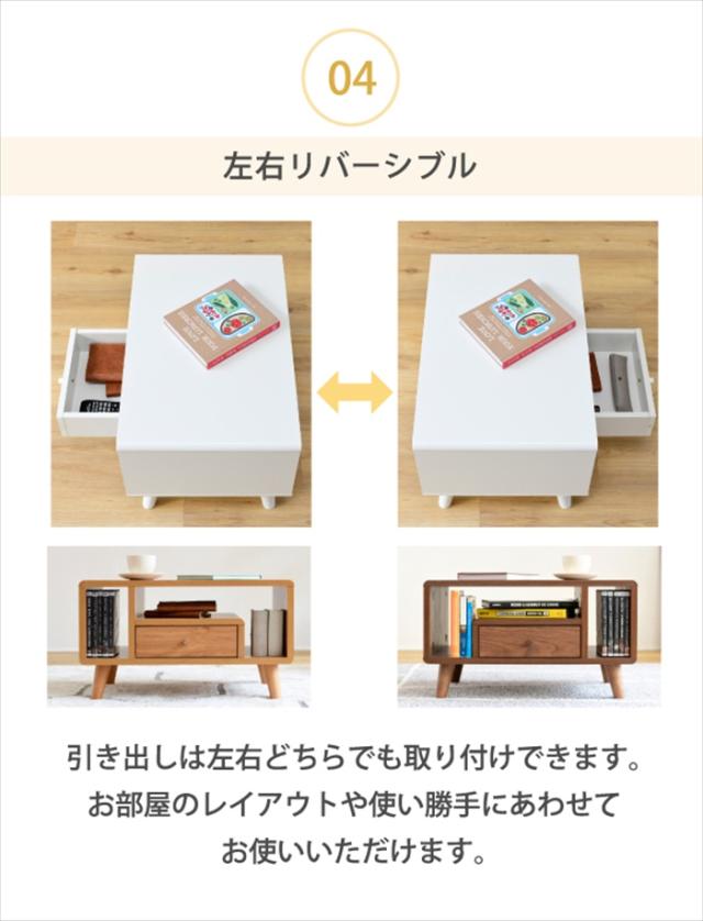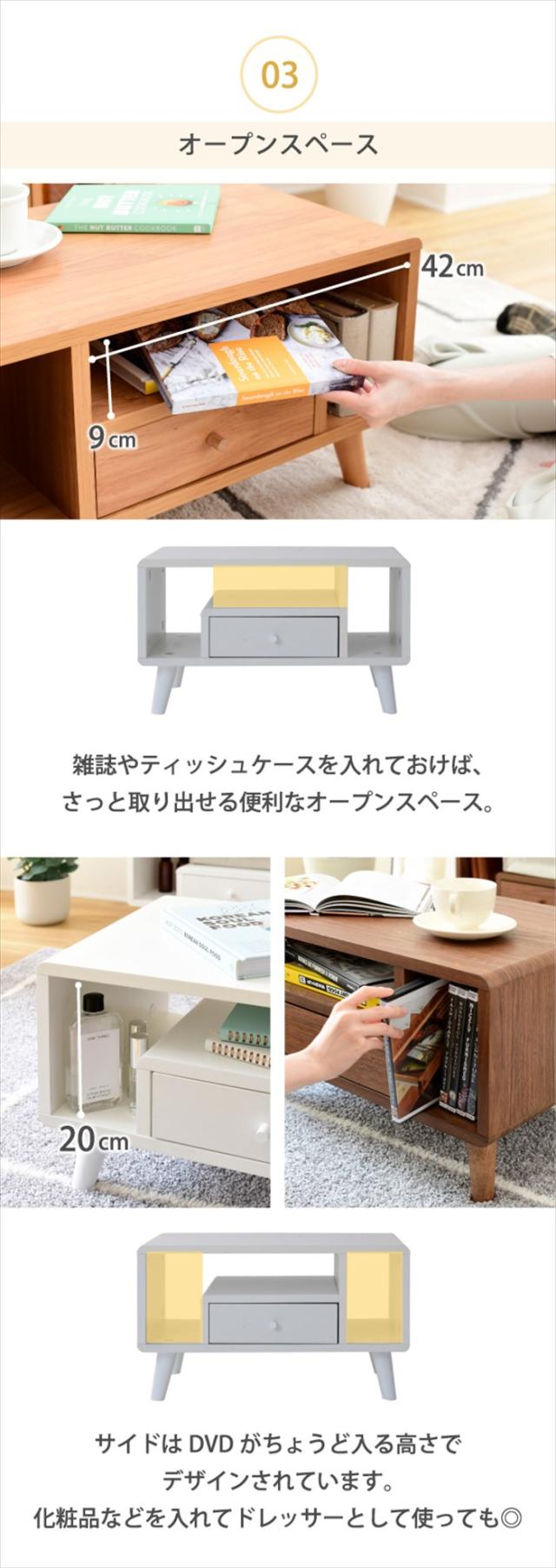 リビングテーブルとしての機能だけでなく、DVDやティッシュ、雑誌が収納できるオープン部、リモコンなどを収納できる引き出し付き。