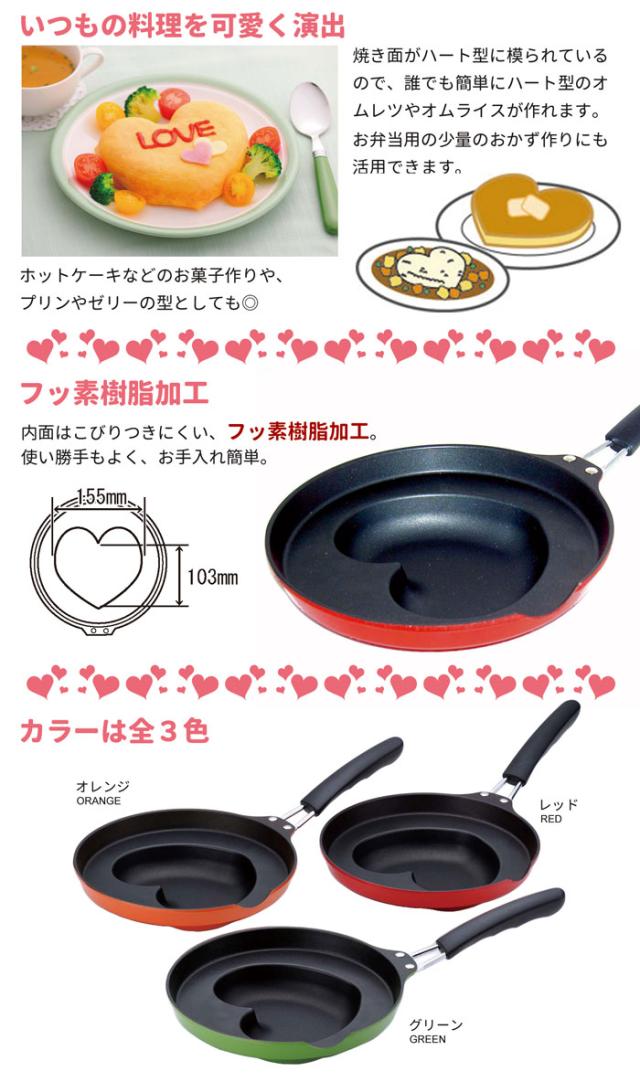 焼き面がハート型に模られているので、誰でも簡単にハート型のオムレツ、オムライスが作れます。