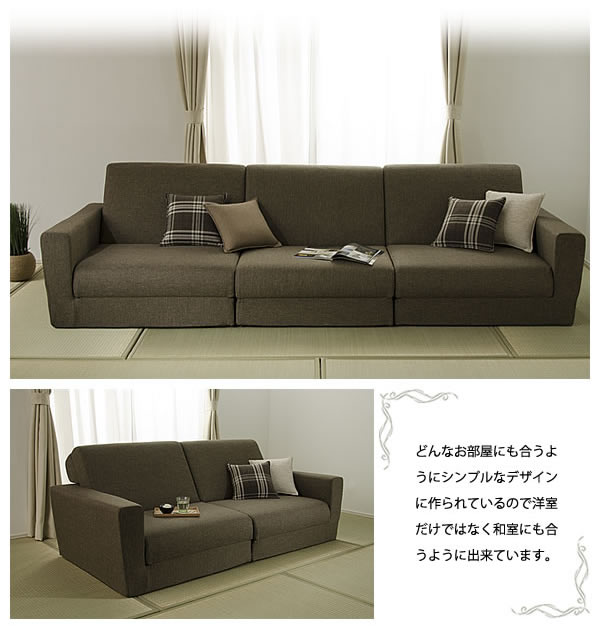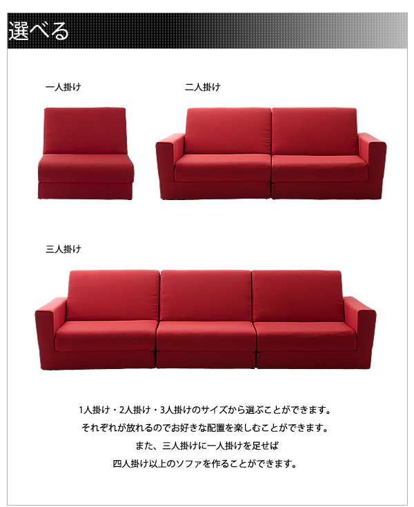 ジョイント式で増やして3人掛け以上のソファにすることもできるワイドソファ。背が斜めに作られているので、ゆっくりとくつろぐことが出来ます。折り返しの部分を伸ばして壁に寄り掛かれば、ハイバックソファになり、頭まで寄り掛かることが出来ます。ソファがずれないように座面裏で固定できるようになっています。それぞれ2か所ファスナーが付いているので、背もたれ部分を外すことができます。大きめ設計なので二人掛けでも1600mmと十分な幅があります。安心の日本製、熟練した職人の手作りでひとつひとつ丁寧に作られています。■サイズ:約幅800×奥行950〜2400×高さ480〜710mm■重量:約26kg■材質:[構造材]スチールパイプ [クッション材]ウレタン [生地]ファブリック ポリエステル100%■機能:ポケットコイル入り■梱包サイズ:約950×490×950mm■生産国:日本■出荷タイミング:約1週間でのお届けになります。※ご注文をいただいてからひとつひとつ丁寧に作っております。