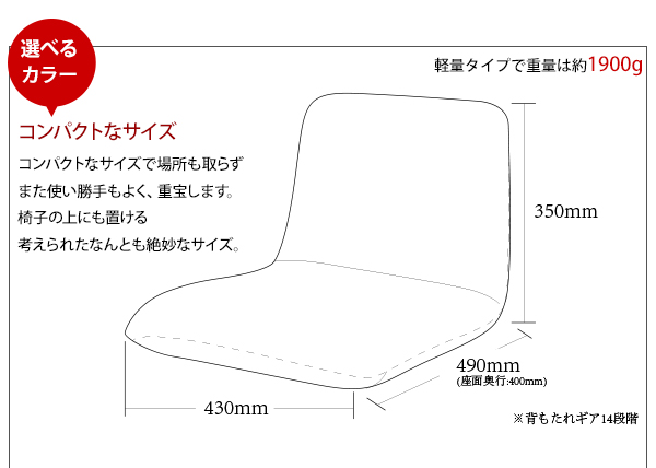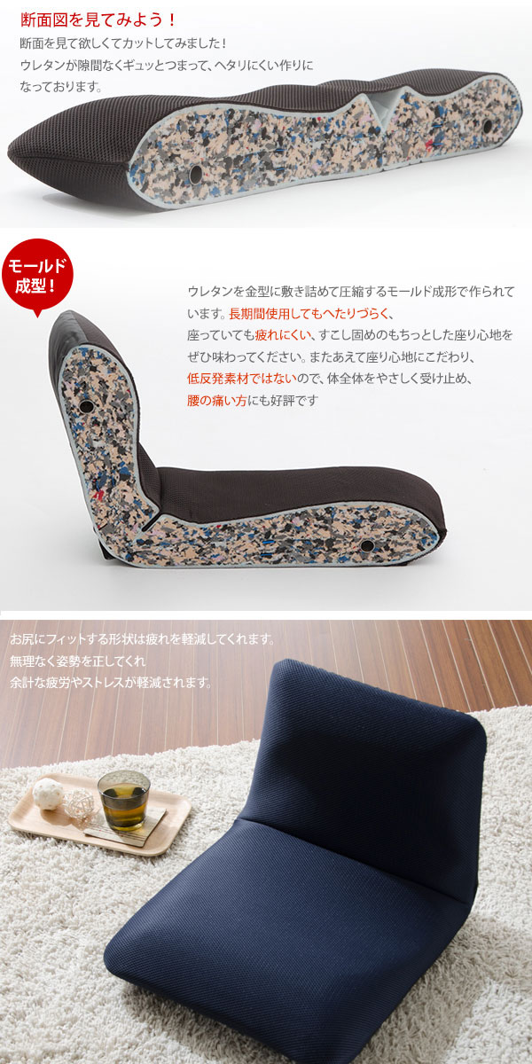背筋ピン座椅子 Sサイズ。美大出身のインハウスデザイナーが人間の体に合わせた形状を細部にこだわってデザイン。お尻にフィットするようにモールド成型で正しい姿勢に自然になるように考えられています。ウレタンを金型に敷き詰めて圧縮するモールド成型。長期間使用してもヘタリにくく、座っていても疲れにくく、少し硬めのもっちりとした座り心地。低反発素材を使用せず、体全体をやさしく受け止めるので、腰痛の方にも好評です。日本メーカーKOYO製のギアを採用。14段階のスムーズなギアチェンジが可能。ギアはウレタンに包まれているので、床を傷つける心配がありません。椅子の上にも置ける考えられたなんとも絶妙なサイズ感。■サイズ:約幅420×D510〜710×H100〜335mm■重量:約2kg■材質:ポリエステル■機能:(背)14段階リクライニング機能付■梱包サイズ:W160×D420×H720mm■生産国:日本■出荷タイミング:約1週間でのお届けになります。※ご注文をいただいてからひとつひとつ丁寧に作っております。