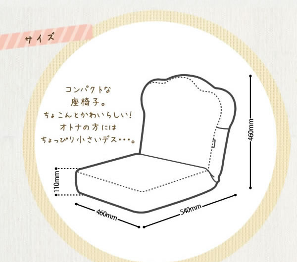 食パンみたいな座椅子。座面は低反発ウレタンを採用し、座る方に合わせて形状変化するので、一度座った形状が持続し、長時間でも無理なく過ごせます。生地はふわふわの起毛素材。背もたれ部は5段階でリクライニング。ちょこんとかわいらしいサイズでお子様にぴったり。※大人には少し小さめですが、背の小さい方でしたら十分お使いいただけます。安心の日本製、熟練した職人の手作りでひとつひとつ丁寧に作られています。ギアも安心の日本製。■サイズ:約幅460×奥行540〜880×高さ110〜460mm■座面高:約110mm■重量:約2.6kg■材質:[構造材]スチールパイプ [クッション材]ウレタンフォーム [表生地]ポリエステル100% [裏生地]ポリエステル100%■タイプ:トースト、食パン、メロンパン■機能:(背もたれ部)5段階リクライニング■梱包サイズ:約460×650×1000mm■生産国:日本■出荷タイミング:約1週間でのお届けになります。※ご注文をいただいてからひとつひとつ丁寧に作っております。