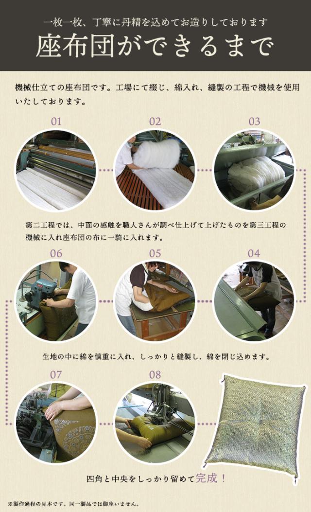 | 煌びやかで落ち着きのある風合いの仏前座布団。 お仏壇の前で日常的に使われ、お寺様が来るときや法事・法要に欠かせないアイテムです。 上品な生地で仕立てた国産品で、一年を通してご使用いただけます。 御前座布団、仏壇座布団、寺用座布団、法要座布団、法事座布団、仏前座布団、仏事座布団、導師座布団、お坊さん用座布団などと呼ばれています。 |