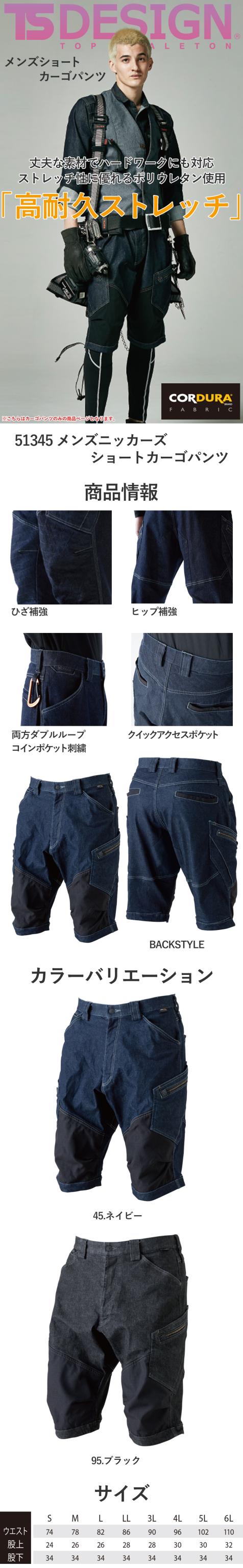 作業服 ストレッチ デニム ハーフパンツ 藤和 TS Design メンズ ニッカーズ ショートカーゴパンツ 51345 作業着 通年 秋冬 丈夫 人気 おしゃれ かっこいい 建築 運送 高所作業