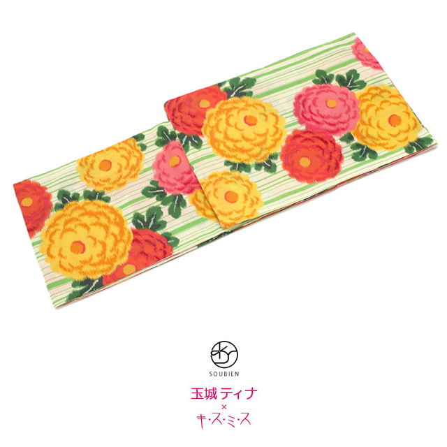 浴衣 レディース 玉城ティナ×キスミス 緑色 グリーン 黄色 カラフル 菊 花柄 縞 ストライプ 綿 紅梅織 モダン 夏祭り 花火大会 女性用 仕立て上がり 【フリーサイズ】