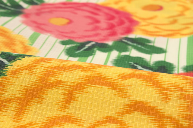 矢鱈縞のストライプ地に、カラフルな菊の花がデザインされたレトロモダンな柄ゆきです。