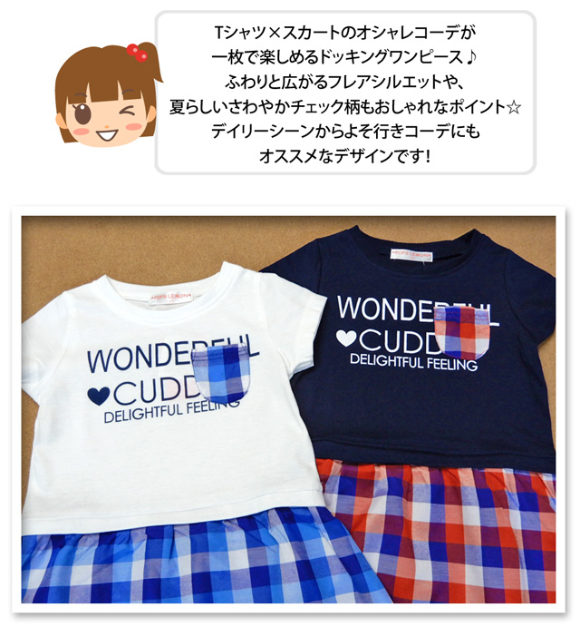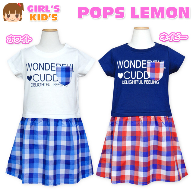 [特長]・POPS LEMON(ポップスレモン)・ドッキングワンピース・半袖Tシャツ× チェック柄スカート・重ね着風/フェイクレイヤード・ロゴプリント ・胸ポケット1P・ゆったりシルエット ・襟リブ・子供用 ・女の子