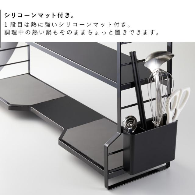 1段目は熱に強いシリコーンマット付きで、調理中の熱い鍋もそのまま一時置きできます。
