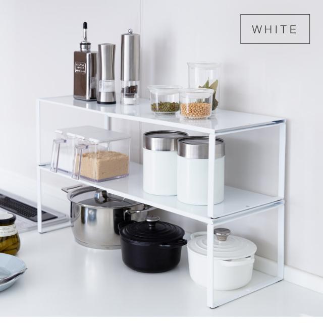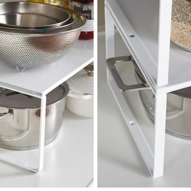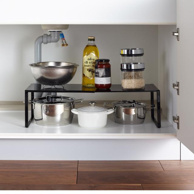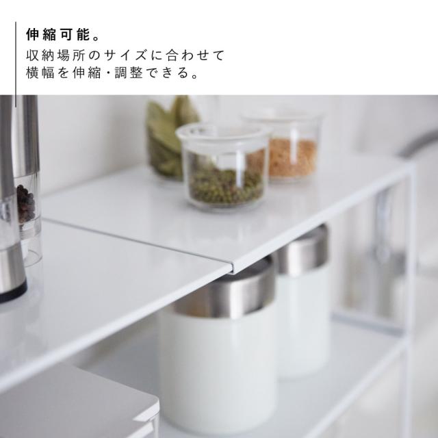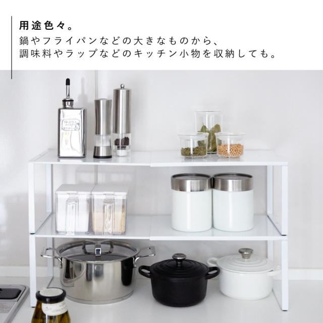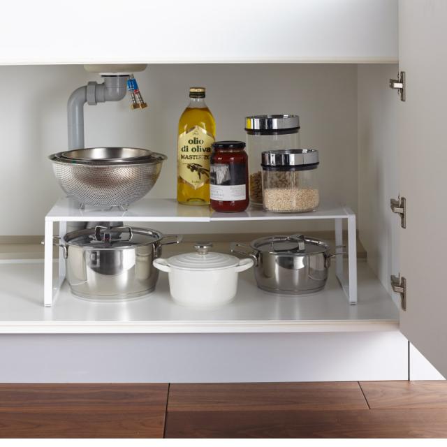 収納場所のサイズに合わせて横幅を調整できる、丈夫なスチール製の伸縮棚。鍋やフライパンなどの大きなものから、調味料やラップなどの小さなキッチン小物まで収納できます。