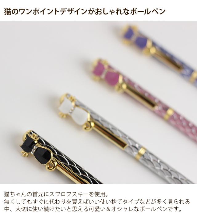 クリップ部分に猫のシルエットワンポイントがついたキラキラのボールペンです。猫の首元には首輪やリボンのようにスワロフスキーが施されています。