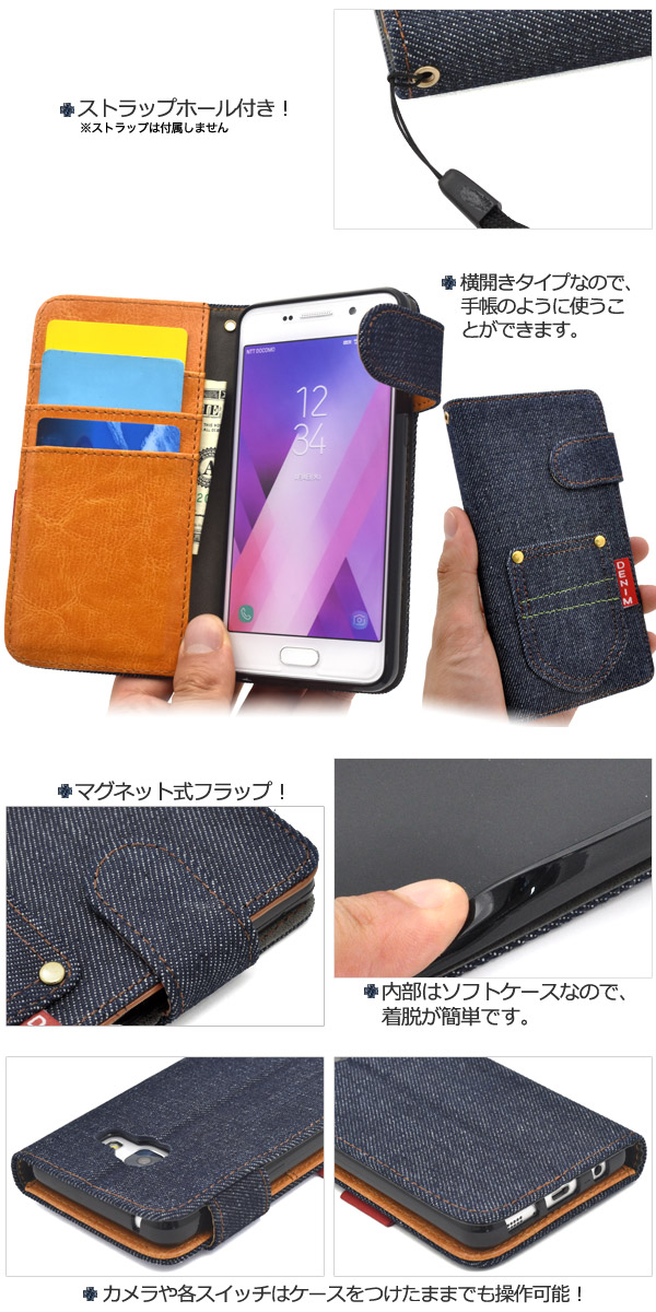 デニムデザインの手帳型ケース。衝撃やキズなどからスマホを守ります。内部ケースはソフトケースなので、着脱が簡単です。男女どちらでもお使いいただける、スタイリッシュなデニムデザイン。内側は落ち着いたレザーデザインです。落下防止に便利なストラップホール付きです。また、内側に3つのカードポケットとサイドポケット付きです。※スマートフォンは付属しません。※ライセンス商品ではありません。 ※ケースをつけたまま撮影できますが、フラッシュ撮影時にケースの色が移り込むことがあります。