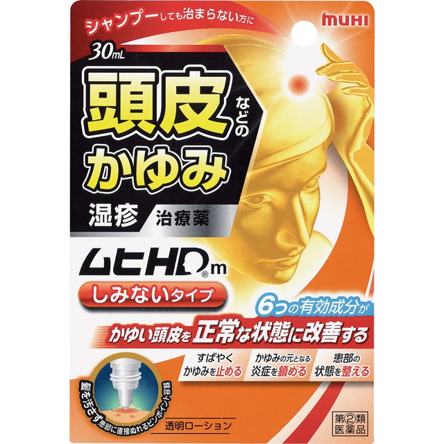 ■ムヒHDmの特長 6つの有効成分が炎症をともなうかゆい頭皮を正常な状態に改善します すばやくかゆみを止める1.ジフェンヒドラミン塩酸塩(かゆみ止め成分)2.l−メントール(清涼感成分)かゆみの元となる炎症を鎮める3.プレドニゾロン吉草酸エステル酢酸エステル(PVA)(抗炎症成分)患部の状態を整える4.イソプロピルメチルフェノール(殺菌成分)5.アラントイン(荒れた頭皮の修復を助ける成分)6.パンテノール(荒れた頭皮の修復を助ける成分)PVAは、一般薬では効果の高いランクに分類されるステロイド成分です。患