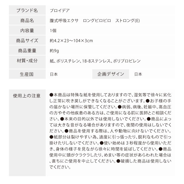 もっと!腹式呼吸エクササイズ!ロングピロピロ ストロング。TV・雑誌で話題沸騰、深く息をするだけのロングブレスが気になるボディを直撃!約1mの特殊ロングピロピロがボディにガンガン響く!更に、吹き口直径が従来品の1/2になり、かかる負荷も増大!※従来品吹き口直径6mm→ストロング3mm。 従来のピロピロでは物足りないあなたへ。本気で1日10吹にトライ! 【素材】紙、ポリスチレン、18-8ステンレス、ポリプロピレン 【素材】紙、ポリスチレン、18-8ステンレス、ポリプロピレン 【生産国】日本