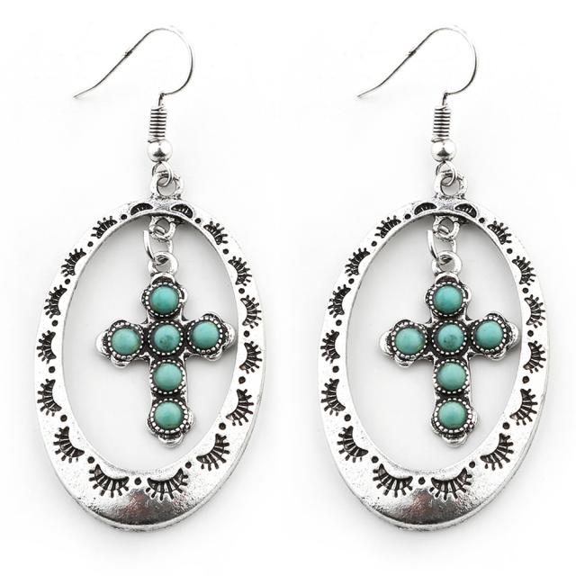 楕円形の丸型のフレームの真中にトルコ石風のビーズをセットした十字架のチャームが揺れるステンレスピアス。