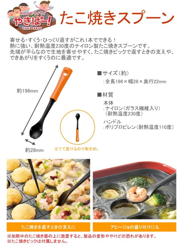 | 特徴 | 寄せる・すくう・ひっくり返すがこれ1本でできる! 熱に強い、耐熱温度230度のナイロン製スプーンです。 先端が平らになっているので生地を寄せやすく、たこ焼きピックが上手に使えなくてもスプーンを支えに使えば簡単にたこ焼きがひっくり返せます。 たこ焼き器の穴にちょうどいいサイズで、たこ焼きだけでなく、アヒージョの盛り付けにも。 金属製とは違ってフッ素加工のたこ焼き器を傷つけにくいので安心して使えます。 ハンドルは三角型なので転がらず、立てて置けるので衛生的。 食器洗い乾燥機対応です。 |