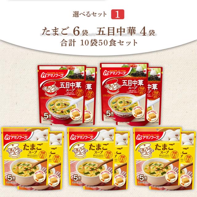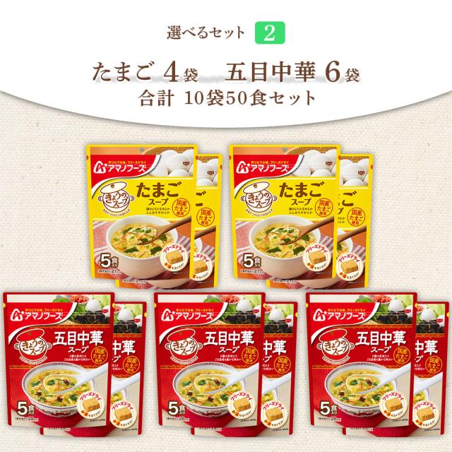 | 内容量 | ■ きょうのスープ 5食入 たまごスープ 36g 五目中華スープ 35g 上記商品を組み合わせた2種類のセットからお選びいただけます。 ※1セット10袋 合計50食 |
