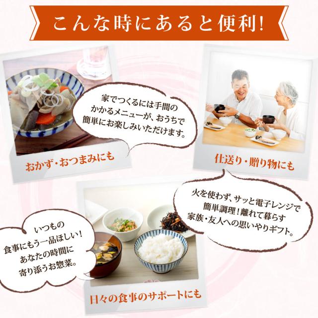 手間のかかる 野菜 根菜 の 煮物 おばんざい が 調理 要らずでそのまま直ぐに召し上がれます。
