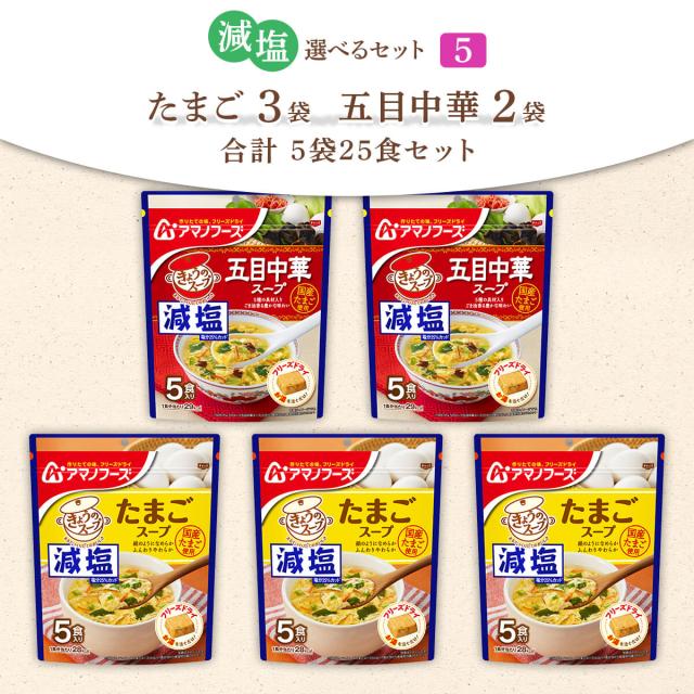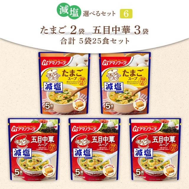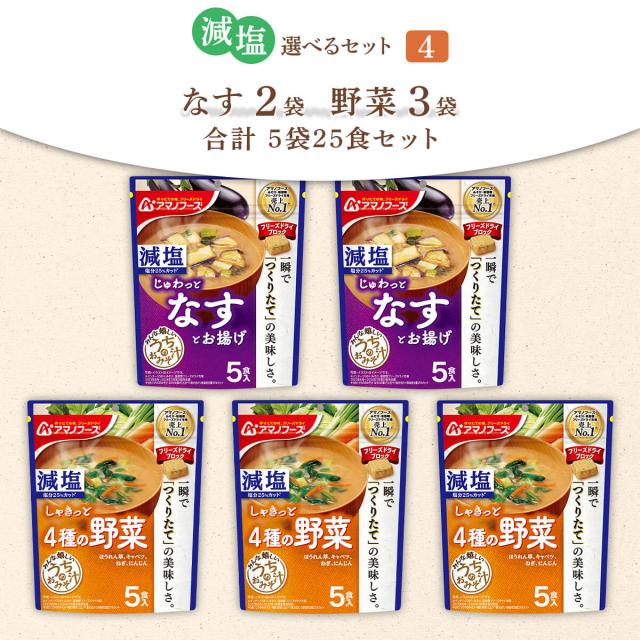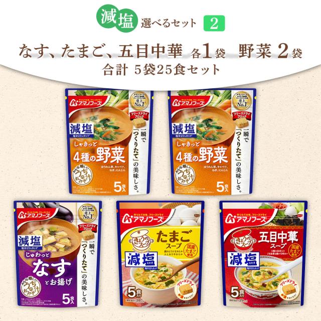アマノフーズ 減塩 うちのおみそ汁 きょうのスープ 詰め合わせ セット から好きなタイプを 選べる 通常より食塩相当量25%カットした 減塩 シリーズ 1袋5個入り( 個包装 )パック フリーズドライ食品 は 味 香り 栄養 はそのままに お湯を注ぐだけ で「 簡単 美味しい 」をご提供できます。