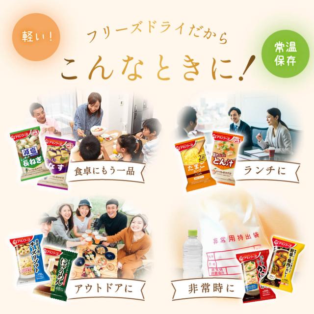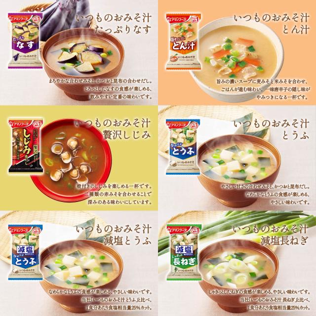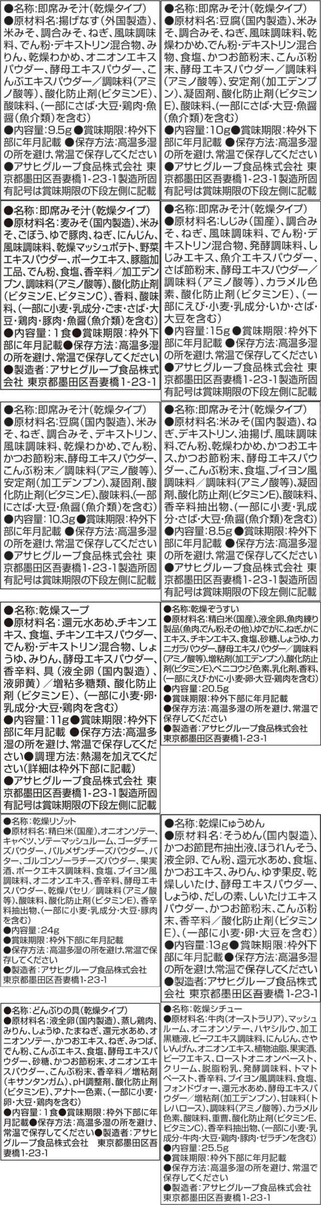 | 内容量 | ■ いつものおみそ汁 なす 9.5g とうふ 10g とん汁 10.5g ■ いつものおみそ汁 贅沢 しじみ 赤だし 15g ■ 減塩 いつものおみそ汁 減塩とうふ 10.3g 減塩長ねぎ 8.5g ■ Theうまみ たまごスープ 11g ■ 雑炊 ほぐし身入り かに雑炊 20.5g ■ リゾット 濃厚3種のチーズリゾット 24g ■ にゅうめん すまし柚子 13g ■ 丼の具 とろっと卵の親子丼の具 22.5g ■ シチュー 5種具材のビーフシチュー 25.5g ■ カレー 野菜と鶏肉のカレー 36.4g 13種 13食 |
