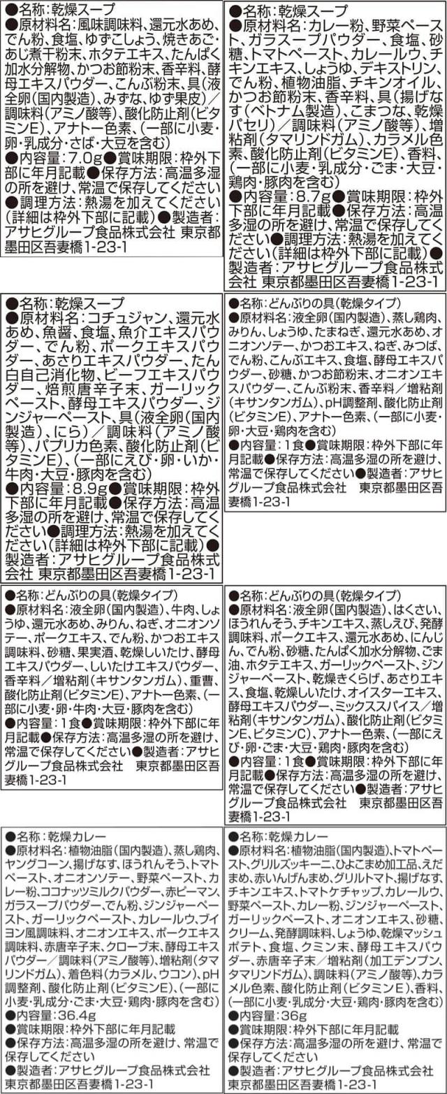 | 内容量 | ■ Theうまみ ごはんがうまい! 特製たまごスープ 7.0g スパイスカレースープ 8.7g 旨辛チゲスープ 8.9g ■ カレー 野菜と鶏肉のカレー 36.4g ひきわり豆のトマトカレー 36g 各1食 ■ 丼の具 とろっと卵の親子丼の具 22.5g 甘とろ卵の牛とじ丼の具 23.8g 七種具材の中華丼の具 17g 各2食 8種 11食 |