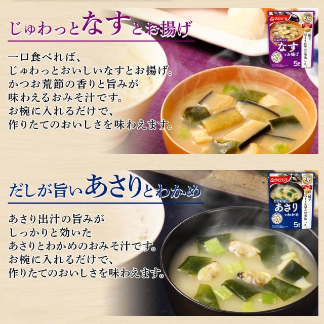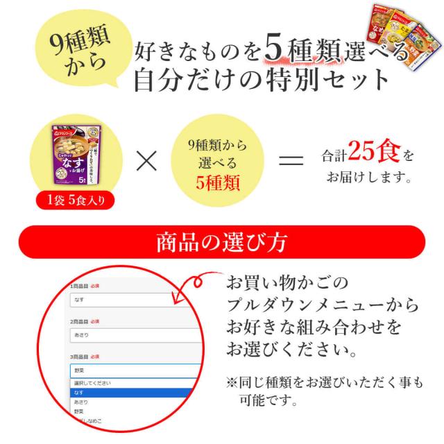 | リニューアル内容 | 下記商品を追加し、選べる種類を9種から10種に変更しました。 ■ うちのおみそ汁 5食入 あさりとわかめ 31g |