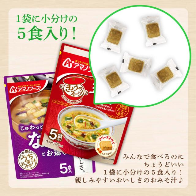 家族 みんなで食べるのにちょうどよい うちのおみそ汁 きょうのスープ 1袋5食入り 1食ごとに個包装 味 香り 栄養 はそのままに お湯を注ぐだけ 簡単 美味しい 即席味噌汁 インスタントスープ です。