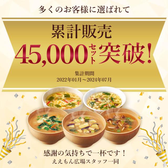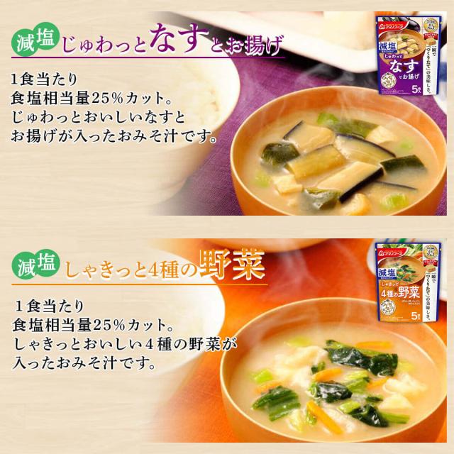 | 内容量 | ■ うちのおみそ汁 5食入 なすとお揚げ 44g あさりとわかめ 31g 4種の野菜 40.5g なめことわかめ(赤だし) 36.4g ■ 減塩 うちのおみそ汁 5食入 減塩なすとお揚げ 41.5g 減塩4種の野菜 38.5g ■ きょうのスープ 5食入 たまごスープ 36g 五目中華スープ 35g ■ 減塩 きょうのスープ 5食入 減塩たまごスープ 35g 減塩五目中華スープ 36.5g 10種類の中から5袋(25食)お選びいただけます。 |