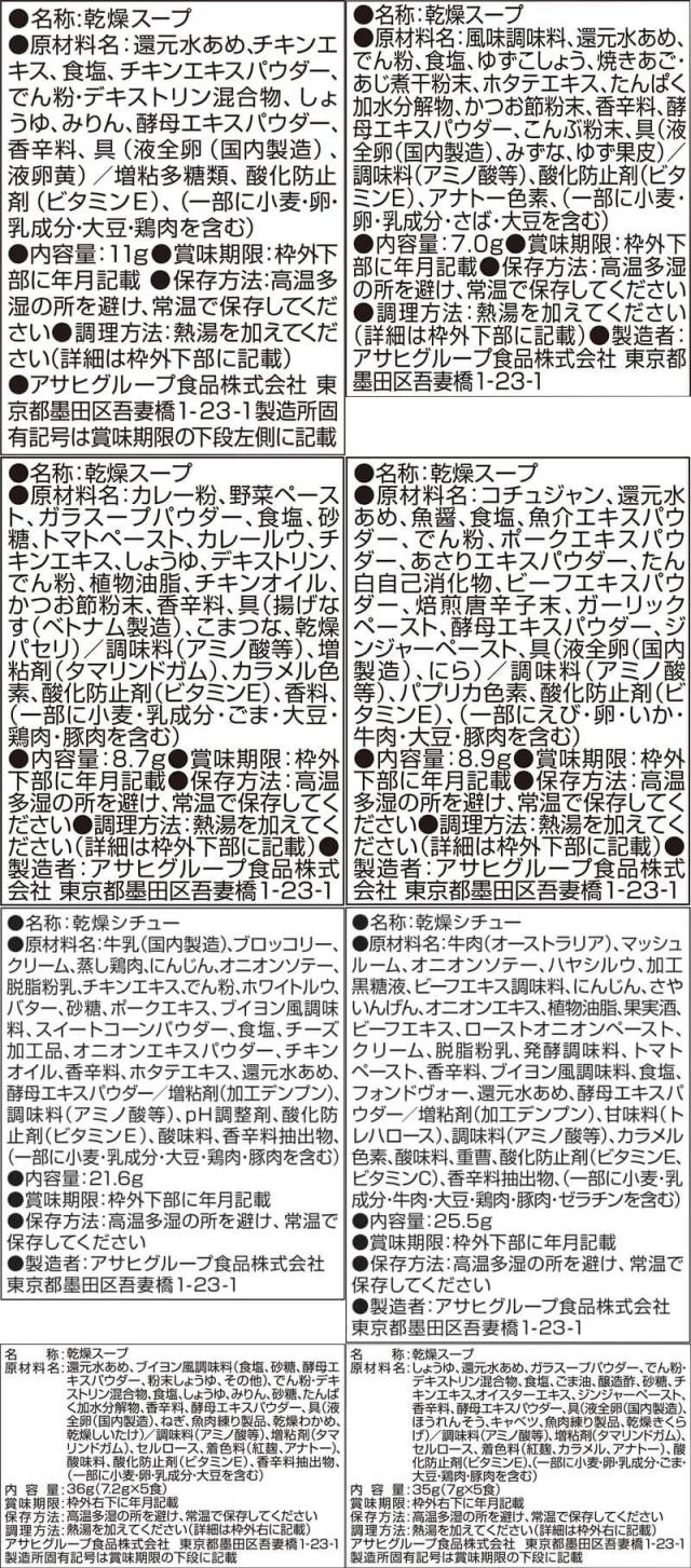 ■ Theうまみ たまごスープ 11g ■ Theうまみ ごはんがうまい! 特製たまごスープ 7.0g スパイスカレースープ 8.7g 旨辛チゲスープ 8.9g ■ シチュー 彩り野菜のクリームシチュー 21.6g 5種具材のビーフシチュー 25.5g 各2食 ■ きょうのスープ 5食入 たまごスープ 36g 五目中華スープ 35g 各1袋 8種 22食 |