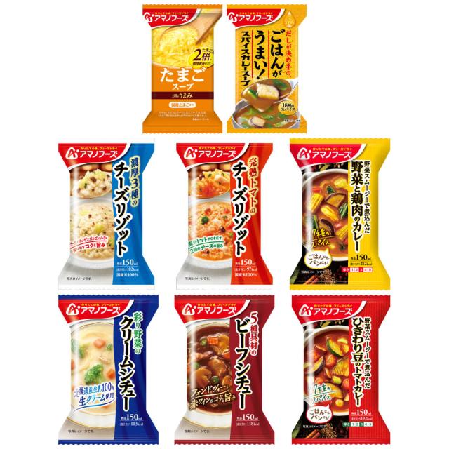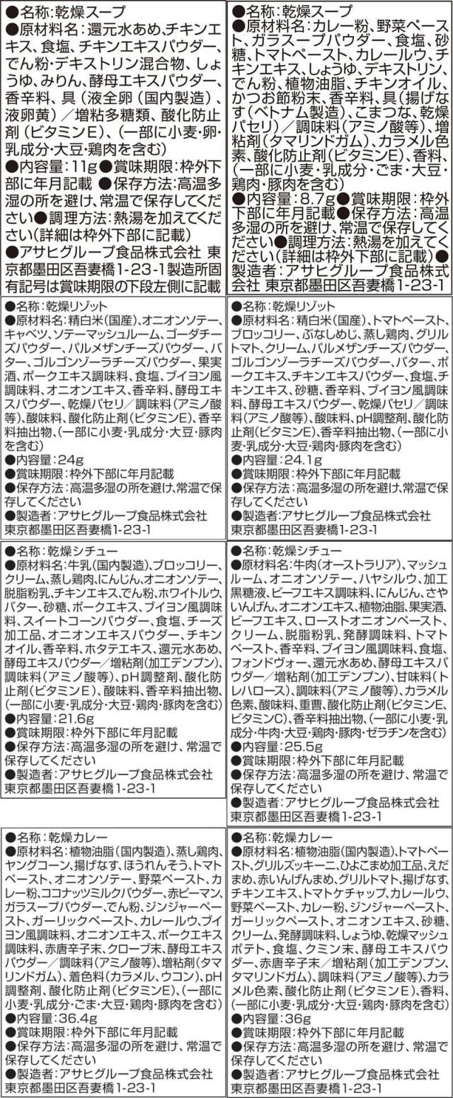 | 内容量 | ■ Theうまみ たまごスープ 11g ■ Theうまみ ごはんがうまい! スパイスカレースープ 8.7g 各4食 ■ リゾット 濃厚3種のチーズリゾット 24g 完熟トマトのチーズリゾット 24.1g 各2食 ■ シチュー 彩り野菜のクリームシチュー 21.6g 5種具材のビーフシチュー 25.5g ■ カレー 野菜と鶏肉のカレー 36.4g ひきわり豆のトマトカレー 36g 各1食 8種 16食 |