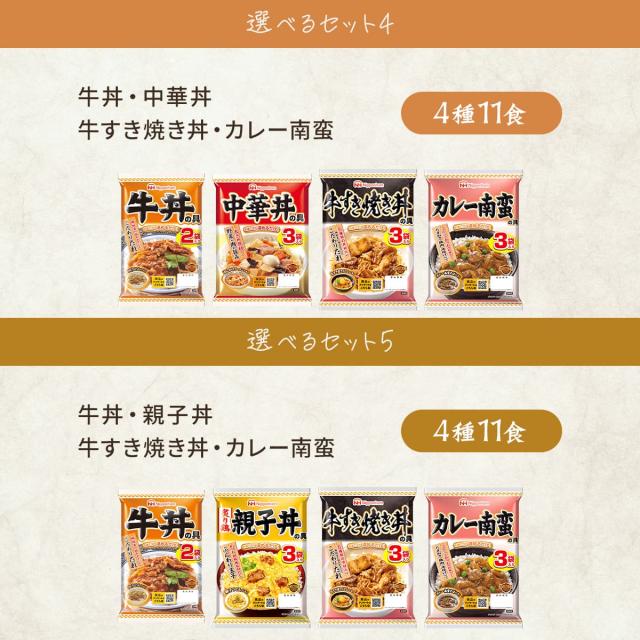 ■ 4種11食(牛丼・中華・親子・麻婆)セット ▽どんぶり繁盛 (1袋 2食入) 牛丼の具 120g ▽どんぶり繁盛 (1袋 3食入) 中華丼の具 138g 親子丼の具 160g 麻婆丼の具 140g ■ 4種11食(牛丼・中華・親子・牛すき)セット ▽どんぶり繁盛 (1袋 2食入) 牛丼の具 120g ▽どんぶり繁盛 (1袋 3食入) 中華丼の具 138g 親子丼の具 160g 牛すき焼き丼の具 95g ■ 4種11食(牛丼・親子・麻婆・牛すき)セット ▽どんぶり繁盛 (1袋 2食入) 牛丼の具 120g ▽どんぶり繁盛 (1袋 3食入) 親子丼の具 160g 麻婆丼の具 140g 牛すき焼き丼の具 95g ■ 4種11食(牛丼・中華・牛すき・カレー南蛮)セット ▽どんぶり繁盛 (1袋 2食入) 牛丼の具 120g ▽どんぶり繁盛 (1袋 3食入) 中華丼の具 138g 牛すき焼き丼の具 95g カレー南蛮の具 110g ■ 4種11食(牛丼・親子・牛すき・カレー南蛮)セット ▽どんぶり繁盛 (1袋 2食入) 牛丼の具 120g ▽どんぶり繁盛 (1袋 3食入) 親子丼の具 160g 牛すき焼き丼の具 95g カレー南蛮の具 110g 5種類のセットからお選びいただけます。 |