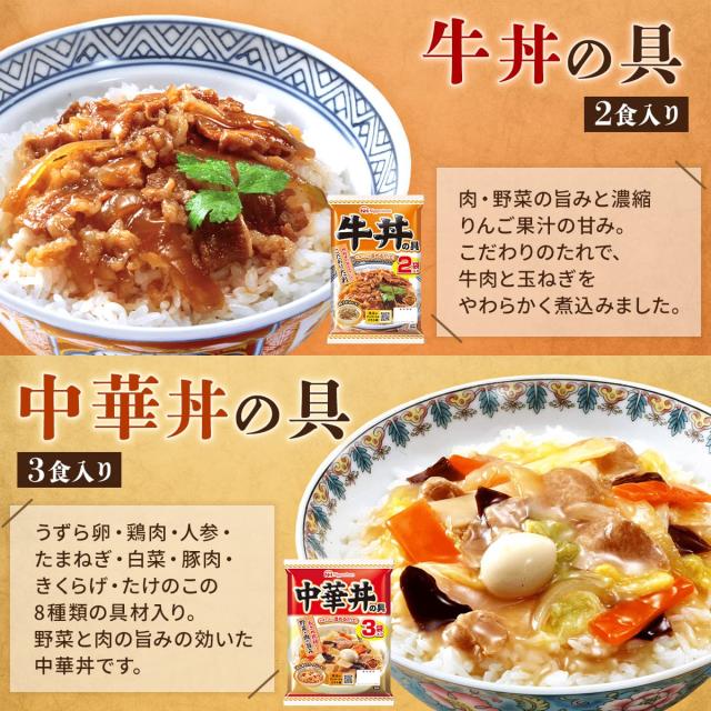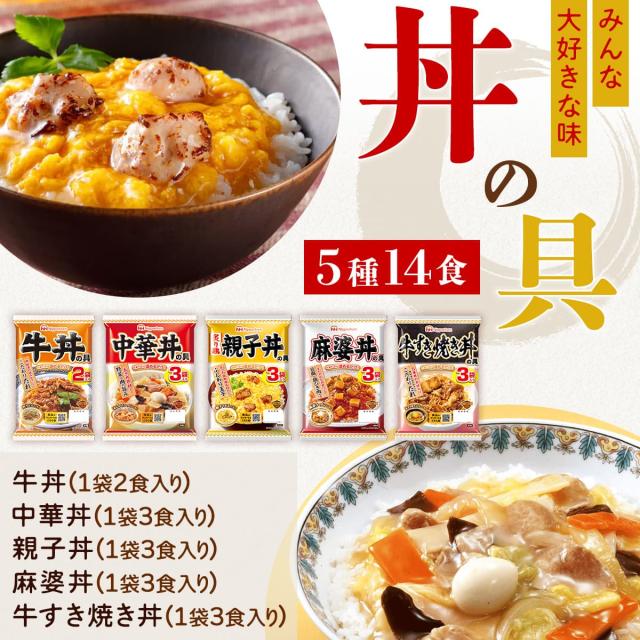 ■ どんぶり繁盛 (1袋 2食入) 牛丼の具 120g ■ どんぶり繁盛 (1袋 3食入) 中華丼の具 138g 親子丼の具 160g 麻婆丼の具 140g 牛すき焼き丼の具 95g 各1袋 5種 14食 |