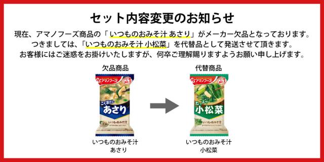 | 内容量 | ■ いつものおみそ汁 なす 9.5g あさり 7.4g あおさ 8.2g とうふ 10g ほうれん草 7g 長ねぎ 9g 野菜 10g ごぼう 9g 里いも 9g とん汁 10.5g なめこ 赤だし 8g 赤だし 三つ葉入り 7.5g ■ いつものおみそ汁 贅沢 焼なす 9.1g とうふ 10.5g 豚汁 12.5g 15種 各2食 合計30食 |