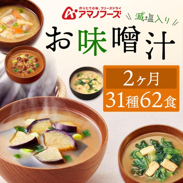 アマノフーズ フリーズドライ 減塩 入り 味噌汁 2ヶ月 31種62食 詰め合わせ セット 【 送料無料 沖縄以外】 インスタント味噌汁 常温保存 減塩味噌汁 いつものおみそ汁 旨だし プレゼント 贈り物 保存食 バレンタイン 2026 内祝い ギフト