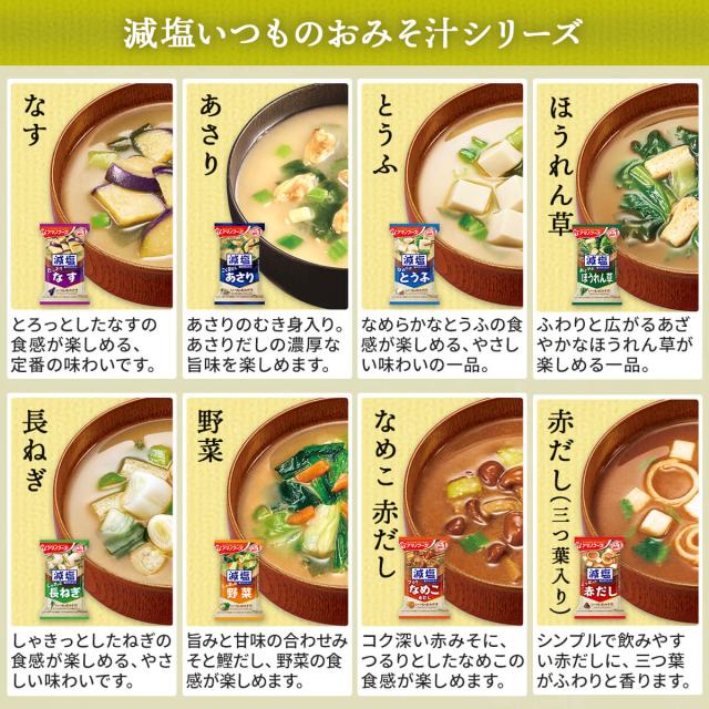 毎日食べたくなる いつものおみそ汁 味噌汁の具 にこだわった いつものおみそ汁 贅沢 通常商品より 塩分 25%カット 健康 をアシスト 減塩 いつものおみそ汁 旨だし お味噌汁 の4シリーズ