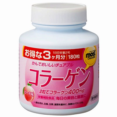 人気美容素材のコラーゲンと美容アミノ酸(アルギニン、プロリン、シスチン)を配合した美味しいピーチ味のチュアブルタイプ。