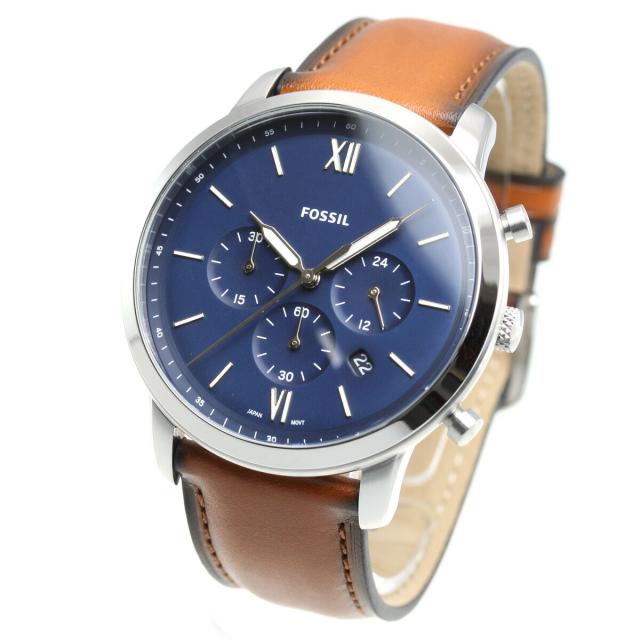 44mmサイズのステンレススチールケースに、クォーツ式クロノグラフムーブメントを搭載したNEUTRA。サテン仕上げをほどこしたブルーダイヤル(文字盤)に、バーインデックスのアワーマーク、ブラウンのレザーストラップの組み合わせです。【フォッシル FOSSIL】