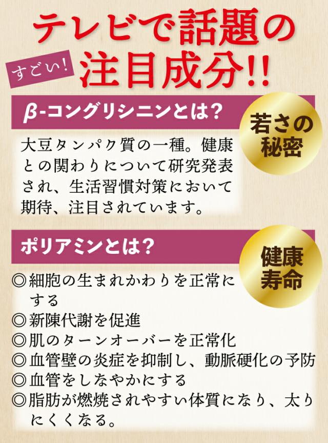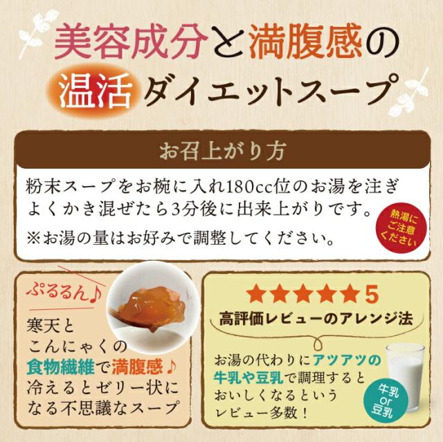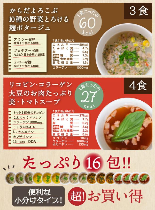 【麹のポタージュ】豆乳粉末、コラーゲン、脱脂粉乳、難消化性デキストリン、グラニュー糖、米麹、食塩、米粉、チキンエキス、ポークエキス、ガーリックパウダー、オニオンパウダー、こんにゃく粉末、90種植物発酵エキス、食用植物油脂、うきみ・具(粒状大豆加工品、乾燥キャベツ、人参、ごぼう、たまご、オニオン、椎茸、コーン、ねぎ、ごま、パセリ)、調味料(アミノ酸等)、ゲル化剤(増粘多糖類)、L−カルニチン、(原材料の一部に大豆、豚肉、鶏肉、ゼラチンを含む)