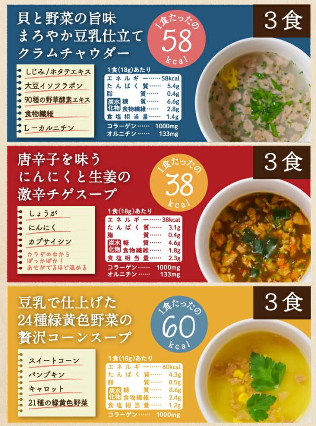 ■原材料:【クラムチャウダー】豆乳粉末、脱脂粉乳、コラーゲン、砂糖、難消化性デキストリン、食塩、チキンエキス、オニオンパウダー、しじみエキス、L-オルニチン塩酸塩、胡椒、しょうがエキス、野草発酵エキスパウダー、香辛料(カプサイシン)、具・うきみ(大豆加工品、キャベツ、ニンジン、ワカメ、たまご加工品、しじみ、パセリ)加工でん粉、調味料(アミノ酸等)、こんにゃくマンナン、ゲル化剤(増粘多糖類)、発酵乳酸カルシウム、L−カルニチン、二酸化ケイ素、着色料(カラメル色素)(原材料の一部にゼラチン、卵、乳、大豆、鶏肉、小麦、やまいも、りんごを含む)
