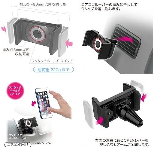 幅60mm〜90mm・厚み15mm・耐荷重220gのスマホに対応