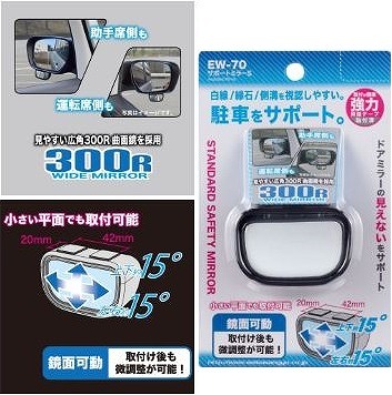 Assisted Mirror ドアミラーの視界を妨げない、吊下げタイプのサポートミラーです。 バックでの駐車時に、白線/縁石/側溝を視認できます。 取付け後も微調整が可能な鏡面可動タイプです。 見やすい広角R300曲面鏡を採用しています。 小さい平面(42mm×20mm)でも取付可能です。 製品サイズ:H45×W67×D35 パッケージ:H180×W110×D40 75g 品番:EW-70 ※画像はイメージです。 ※パッケージ、仕様、品番などの変更が予告なく変更される場合が御座います。 |