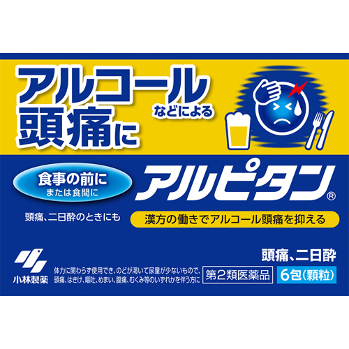 「アルピタン」は、アルコールなどによる頭痛、二日酔いに効くお薬です。漢方処方「五苓散」が、過剰な水分やアルコールの排出を助け、つらい頭痛や二日酔いを抑えます。素早く溶ける顆粒タイプです。