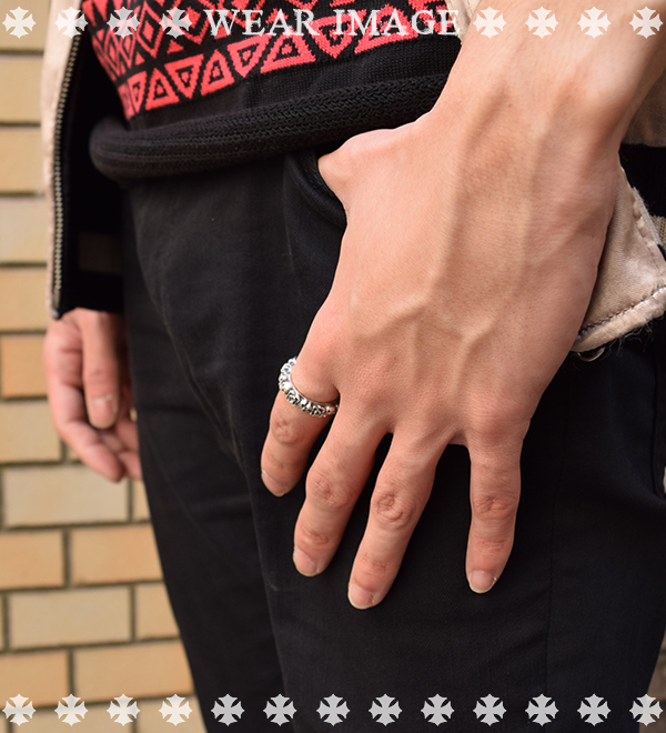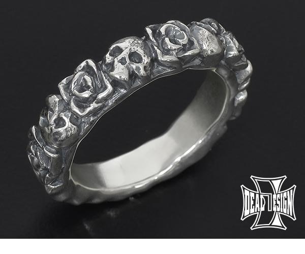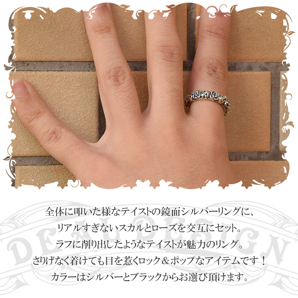 全体に叩いた様なテイストの鏡面シルバーリングに、リアルすぎないスカルとローズを交互にセット。