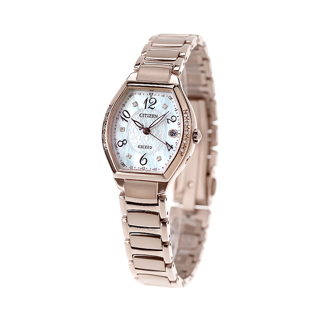 正規品 7年保証キャンペーン 送料無料 シチズン エクシード エコ・ドライブ電波時計 ティタニアライン ハッピーフライトシリーズ 26mm 日本製 電波ソーラー レディース 腕時計 ES9385-57W CITIZEN EXCEED TITANIA LINE HAPPY FLIGHT アナログ ホワイトシェル×サクラピンク* ◆確かな品質と洗練されたデザインによって唯一の価値を生み出す。シチズン エクシードは、まさに「本物」を求める大人にふさわしい時計です。 ハッピーフライトに女性の肌を明るく美しくみせる色、サクラピンク*のモデルが登場。ダイヤモンドが煌く、トノーモデル。贅沢にケースに10ポイント、文字盤に5ポイントのダイヤモンドをセッティング。艶やかな白蝶貝の文字盤に、初夏に咲く花「クレマチス」の模様を彫刻し、華やかさを演出します。プレゼントにもおすすめです。 *サクラピンク、Sakura pinkは、シチズン時計株式会社の商標です。 発売日:18年5月発売